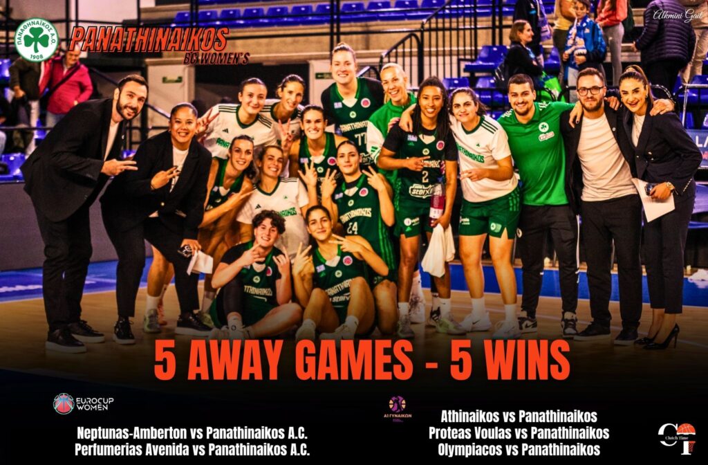Εκεί όπου θέλω να σταθώ, ωστόσο, είναι στο σημείο που ξεχωρίζει πραγματικά τον φετινό Παναθηναϊκό. Αναφέρομαι στην αποτελεσματικότητα του στα εκτός έδρας ματς. Σε Ελλάδα και σε Ευρώπη, το “τριφύλλι” έχει δώσει 5 αγώνες εκτός έδρας. Και… μαντέψτε! Δεν έχουν χάσει ούτε ένα από αυτά τα ματς. Έχουμε και λέμε: Διπλό με τον Αθηναϊκό, διπλό στη Λιθουανία, διπλό στη Βούλα, διπλό στην Ισπανία, διπλό στο ΣΕΦ. Από όλες αυτές τις αναμετρήσεις, τα κορίτσια έφυγαν νικήτριες.