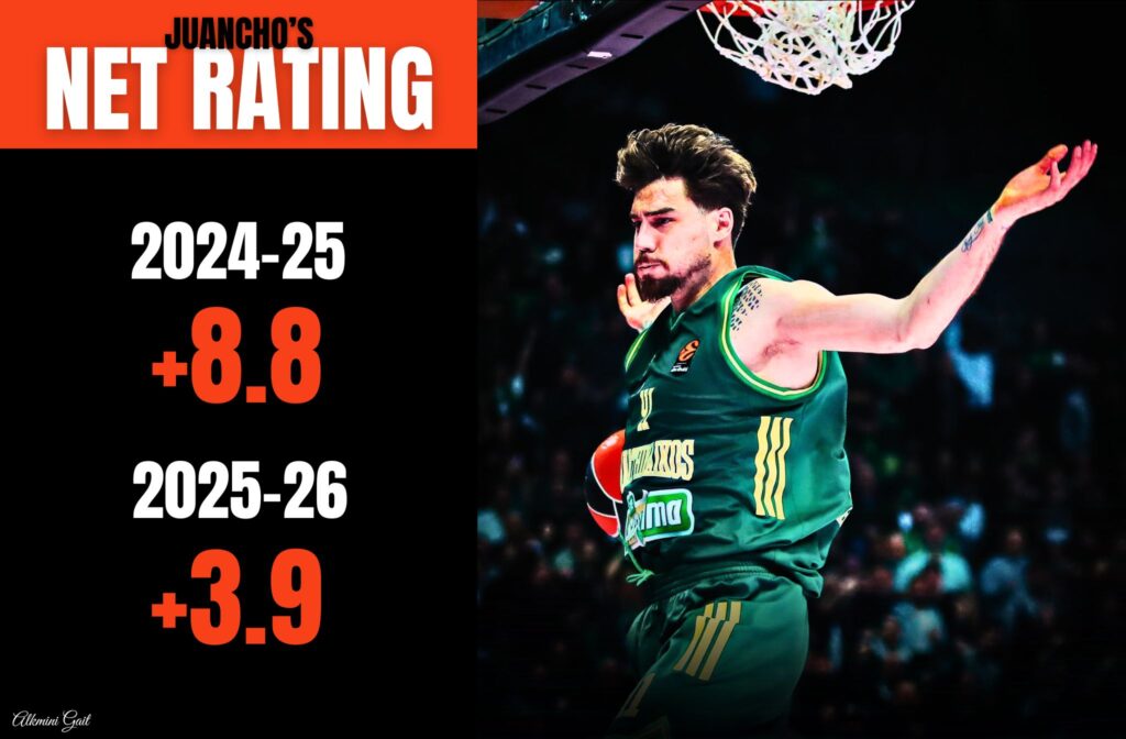 Κάτι ανάλογο συναντάμε και στην άλλη πλευρά του αιώνιου ντέρμπι. Από την έναρξη της περασμένης σεζόν μέχρι σήμερα, ο Χουάντσο Ερνανγκόμεθ έχει το μεγαλύτερο Net Rating ανάμεσα στους παίκτες του βασικού rotation του Παναθηναϊκού. To Net Rating είναι η διαφορά πόντων υπέρ/κατά ανά 100 κατοχές. Με πολύ απλά λόγια, είναι το πώς “αναπνέει” η ομάδα όταν ένας παίκτης βρίσκεται στο παρκέ. Για να μιλήσουμε με νούμερα, ο Ισπανός την περσινή σεζόν στη κατηγορία αυτή είχε +8.8, ενώ φέτος έχει μέχρι στιγμής +3.9.
