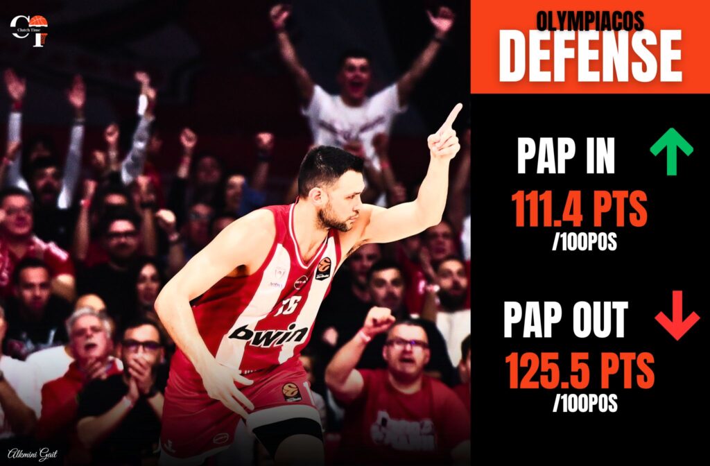 Από τις αρχές Δεκεμβρίου, ο Ολυμπιακός είναι η δεύτερη χειρότερη άμυνα της Ευρωλίγκας με 125.5 πόντους ανά 100 κατοχές. Σε αυτό το διάστημα, στα περίπου 14 λεπτά που παίζει ο Κώστας Παπανικολάου (13.7 λεπτά μέσο όρο), μετατρέπεται στη δεύτερη καλύτερη άμυνα με 111.4 πόντους ανά 100 κατοχές. Αυτό σημαίνει πως οι χώροι κλείνουν με τις αποστάσεις να μειώνονται, οι βοήθειες έρχονται νωρίτερα (στην ώρα τους), τα εύκολα καλάθια κόβονται και τα λάθη μειώνονται δραστικά. Μέσα από αυτά μπορεί να αλλάξει όλος ο ρυθμός ενός ματς.