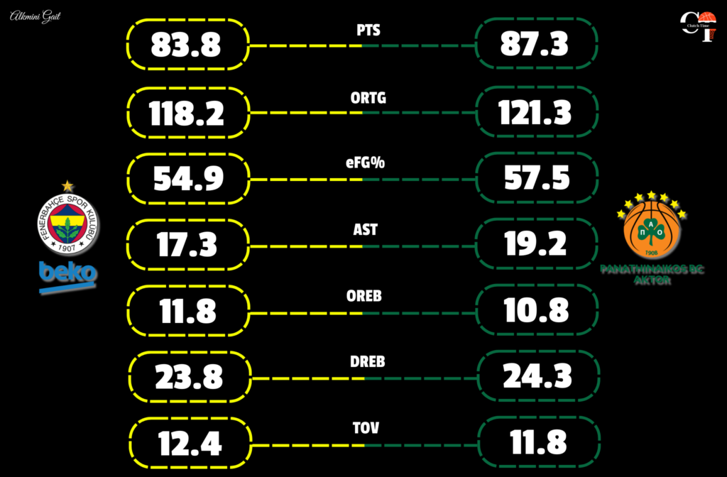 Μια συγκριτική ανάλυση των ομαδικών στατιστικών (μέσοι όροι) επαληθεύει την ισορροπία μεταξύ των δύο ομάδων. Με μια σχετικά κοντινή διαφορά ανάμεσα στο σκοράρισμα, – 87.3 ο ΠΑΟ, 83.8 η Φενέρ – είναι γεγονός πως όλα θα κριθούν στην άμυνα. Και η αλήθεια είναι πως ο Παναθηναϊκός είχε στιγμές τη φετινή σεζόν ειδικά στα πλέι οφ με την Εφές, που χαλάρωσε υπερβολικά και παραλίγο να το πληρώσει (έχανε διαφορές μέχρι και 20 πόντων). Κάτι τέτοιο, σε ένα φάιναλ φορ, δεν συγχωρείται από τον αντίπαλο.